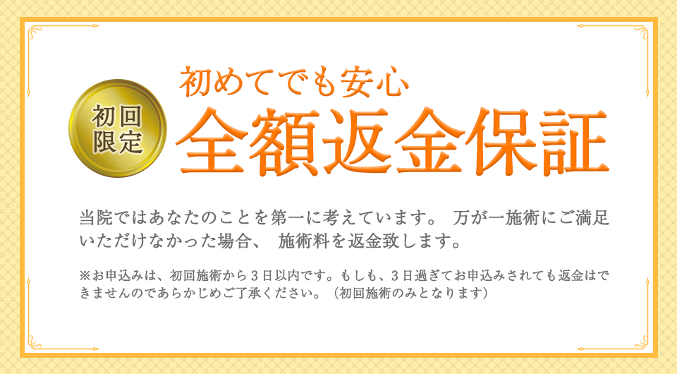そのため「効果があまり感じられない…」と思った場合は、初回の施術が終わった時点でお伝えください。1mmも改善しなければ、その場で初回施術費を全額返金させていただきます。また、もし来院後3日以内に効果が出なければ、もう一度来ていただき無料で再度施術させていただきます。